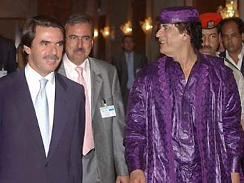 | | Spain's Prime Minister Jose Maria Aznar, left, walks with Libyan leader Colonel Muammar Gaddafi, front right, after Aznar's arrival in Tripoli, Libya, Wednesday Sept. 17, 2003. This was the first visit by a western leader since the lifting of several years of sanctions on the North African country. [AP] |
