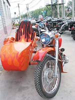 Unlike many other business people who are bored with their chosen profession, he relishes going to work every morning and is happy to mix business with pleasure. With 500 yuan (US$61) in his pocket, the 30-year-old left his small hometown in Hunan Province for Beijing in 1995 in search of his own fortune. After working in different places for three years, the young man got his first big break when he opened his own small business in 1999. Despite his change from employee to boss, Zeng's passion for motorcycle sidecars became stronger as he came to realize that they were not only a way to make a living but a source of happiness. "I used to do motorcycle repair and maintenance in my hometown Xiangtan, a small city in Hunan Province," he explained. "But the business was not good with a lot of debts which were hard to collect. So I thought about leaving for big cities elsewhere." The business was fairly good at the beginning. He even hired several apprentices. Although his shop moved to different locations three times, Zeng gradually found himself becoming more popular among foreigners with sidecars in Beijing. This was partly down to his long experience with motorcycles. His English ability and bright attitude also played an important role. "I got to know two Americans when I was still working in a repair factory," he recalled. "They later introduced me to a man in the Boeing company in Beijing. He was a sidecar enthusiast." The seed of his future passion was sown and would grow quickly. When he moved to his current place near the airport nearly two years ago, he shifted his attention mainly towards sidecar sales and repair. "When I entered the business more than 10 years ago, I did not realize the true value of the vehicle and never expected to see it would mean so much more to people than a form of transportation," said Zeng. The object of his obsession is the Changjiang 750, a rugged, old-looking sidecar. With a history of over 60 years, the origin of the sidecar can be traced back to pre-World War II Germany. The original Changjiang 750 was based on BMW's R-71 (1938-1941), which was sold, lent or leased by BMW to the former Soviet Union for the Red Army. The Russians toughened it up and put it into production as the Ural. In 1957, China acquired a factory as a form of aid from the former Soviet Union. Mass production began in China and continues until today with several brands being produced in different factories. Soon it was widely used by the army, police and law departments of various levels across the country. Interestingly the most basic model remains the bestseller even today, despite many improvements in the engine and appearance to bring new models up to date. "Although it is technically out-dated and looks ugly, the Changjiang 750 is tough and cheap. Many people, including many foreigners, like to ride such an antique-like sidecar," Zeng explained. There are a few factories still making such sidecars in limited numbers today. The displayed new sidecars in Zeng's shop are priced according to their horsepower from 18,000 yuan (US$2,195) to 22,000 yuan (US$2,683), including charges for a one-stop registration service. Swedes and Americans are the biggest foreign buyers. Many even arrange shipment back home after purchase. Zeng has spent more than 20,000 yuan (US$2,493) to turn his own sidecar into a personal plaything. He spent 4,000 yuan (US$488) having the sidecar painted and electroplated. He even bought a piece of hide from the United States to make his own saddles. In Beijing, there are about 2,000 sidecars, among which around 300 are driven by foreigners. Those who often join Zeng's road rides are mostly his friends or people who bought a sidecar from his shop. Usually, from April to August every year, the club organizes outings to different scenic spots around Beijing over weekends. "We had more than 20 sidecars out once. It was a spectacular view on the road