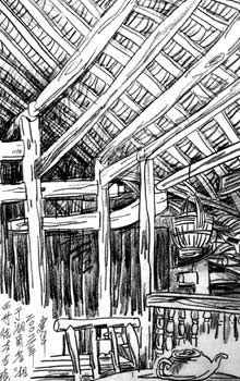 Local men usually engaged in hard work all year round and most of them were in great shape. Luckily, they were willing to be our model as long as our painting would not bother their work. But it is harder to deal with the elderly. "Can we take a photo of you?" Generally he/she would answer: "Two yuan (24 US cents)." "How about drawing a sketch?" "Five yuan (60 US cents)." Though I would pay what they asked, I felt ill at ease. Something which I once cherished most and attracted me to this remote village had been lost in the breeze from the commercialized world. I was also sorry to see that many treasures of the Miao culture had been neglected by local people. The gift shops in the village sold souvenirs which could be found in any scenic spot of the country. While the unique handiwork such as the hand-woven elaborate cloth was only stored in the attic by the local elderly and never appeared in the gift shop. My son and I painted in the scorching sun and had a sense of urgency, not only because our trip was pressed for time, but also because we felt modern civilization had increasing influence on this Miao village. Women in the village were hospitable and sincere. They lent us their new diaojiaolou where we could paint. When we finally finished our work and gave the hostess a China Daily T-shirt to show our gratitude, she beamed radiantly with joy. Exploring the mountain After staying in Dehang for three days, we had drawn sketches of most houses and people in the village. I said to my son jokingly: "I'm too embarrassed to stay here any more."