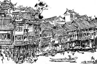 The walk was so relaxing that I could not help but crying out: "Hey..." just like the Miao people singing a folk song. Unexpectedly, we heard "crow, crow, crow" from the other side of river. It was a rooster. My son and I looked at each other and then burst into laughter. There were some booths selling tea and fruit on the way. Most of the sellers were elderly people. I asked one of them to be my model. He agreed, but insisted I must buy his pears in return. The old man was a good model. He sat there quietly until I completed my painting. Thus I managed to draw sketches of a few other dealers. But my son was worn out from carrying a large bag of fruit I had bought along the way. We stopped to take a rest at a tea booth where I completed my last sketch. "That would be the end of our trip!" I told myself. I went down to the brook and soaked my feet in the clear and cool water. There were many crabs on the rock. I lay down on the river bank, stretching my tired limbs and savouring the last moments of our trip.