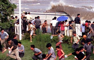 "I know Haining is the best place to watch, but Xiaoshan is nearer to my home," she said. Though it was a sunny day, the river was covered in mist. People had only an indistinct view of the opposite bank. Twice a day, the tide from the East China Sea visits here and carries with it mud, sand, and stone from the lower reaches of the river, so the vast water is yellow and muddy. "It is pretty dry this year, and the high temperatures lasted for nearly a month in Hangzhou, so there is a shortage of water in the river and the tide this year will not be as tall," said Xu Guanqiao, a local policeman who grew up by the Qiantang River. He has been here to maintain the public order for the past 10 years. "Generally speaking, the tide arrives on time, but sometimes influenced by the wind, it will come at an earlier or later time," said Xu. At 1:30 pm, crowds of people started to huddle around the railing starting from the tide-watching pavilion and gazed at the faraway river surface in the east. At 2:39 pm, the crowd was suddenly in a frenzy, some yelling that they saw a white line, but it turned out to be a false alarm. Nothing but a white wide strap stretching obliquely on the river surface could be seen. Five minutes later, a white line finally revealed itself gradually against the background strap, becoming increasingly wider and clearer. Minutes later, its true face came into view, waves about 1.5 metres tall rolling on steadily in a straight line stretching the whole river. When the tide drove near to the hydrometric station about a mile from the pavilion, its southern part was suddenly pulling backward, and the waves beat and submerged the station with its full force and splashed into the air. The energy of the tidal wave seemed to be released greatly after hitting the station, and the waves appeared weak. However, when it passed before the crowds, mud and stones on the riverside were fed into its huge mouth within seconds. Sadly, the grand sound was totally covered by the cheering crowds. Right at that moment, three iron boats drove at their full speed, making a head-on bump with the waves and sending up a fountain of spray, while the ships were thrown into the air and then crashing down onto the water surface heavily, going around like this several times. Accompanying the loud cheers, the tidal wave finally surged off. The boatmen were given loud applause by the local people, most of whom were farmers in the nearby villages. The boatmen believed the fish they caught at that moment would be much fresher. "I set off on the timing of the tide arrival to go back home when it ebbs," said Sun Yonggui, a fisherman of Nanyang Town. After fishing in the river all day long, he appeared tanned and sturdy. The local fishermen all have a good sense for the tide's arrival and seldom make mistakes. Each time the tide comes, they strip naked and run side by side with it, carrying a two-metre-long bamboo pole with a string bag tied on the end. There are a lot of fish of different varieties carried in the tide and the fishermen can make a sizable harvest. Dangerous tide However, the game remains only for those who know its rules. In the meantime, Xu kept reminding people not to go near the riverbank. "Each year, many people die from tide watching, since most of them go beyond the designated tide watching areas," said Xu. Between 1999 and 2001 it claimed 64 casualties. During the past few years, many people, mostly coming out of town, would come to the embankments to wait for the tide. They were not quite aware of the power of the tidal waves, and some came to the riverside to get a better view of the tide, some even jumped into the river to swim. "They have no idea about the arriving time, or its devastating force, so they are most likely to be taken away," said Xu. "When I make my rounds, I repeatedly tell people about the tide and the related safety rules." Sometimes, the tidal waves appear to be far away from people, but the waves could suddenly surge, and there would no time for them to escape. Once they are swept away, it would be impossible to come out again, for the waves are rolling forward with huge momentum. Standing on the part stretching deep into the river of a T-shaped dam will be especially tricky. Though the tide appears to still be far away, the waves from the two sides already steal their way and cut off the retreating route. People could only wait there desperately till they are carried away by the rising waves. "Anyway, it will be absolutely safe for outsiders to watch the tide in the designated areas," said Xu. Apparently, this year most people looked a bit disappointed and seemed not to enjoy themselves to the full, because the tidal waves appeared not as high and grand as it was said to be before, and especially when it comes and goes so quickly. "How about coming tomorrow?" a young man said to his girlfriend.