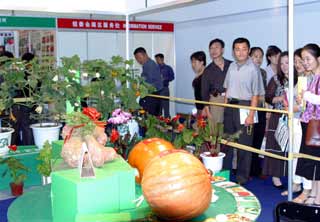 | | Huge pumpkins and big sweet potatoes draw attention of visitors to the Fifth International Fruit and Vegetable Expo. The expo opened September 23, 2003 in Yantai, East China's Shandong Province, and attracted more than 130 business delegations from home and abroad. [newsphoto.com.cn] |