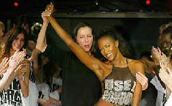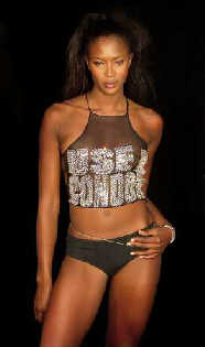Naomi Campbell's fashion meets politics ( 2003-09-25 11:15) (Agencies) Another day at London Fashion Week, another display of beauty, sexy clothes and a celebrity on the catwalk. But the appearance of semiretired supermodel Naomi Campbell on the runway Wednesday wearing a skimpy, sparkling bikini came with a twist — emblazoned across her chest was the slogan, "Use a Condom."