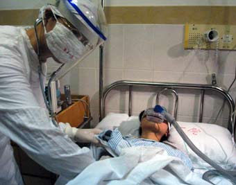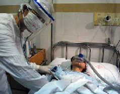 Chinese medics show how to treat a 'patient' suspected of suffering from SARS during a hospital drill in South China's Guangdong Province. [newsphoto.com.cn]