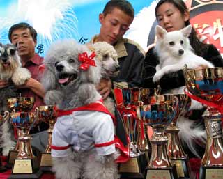 Dogs pose for photos besides the cups they will compete for in Beijing's first pets' ``Olympics'' that began yesterday. The week-long event aims to bring together pet-lovers and encourage people to take care of their animals. [newsphoto.com.cn]
