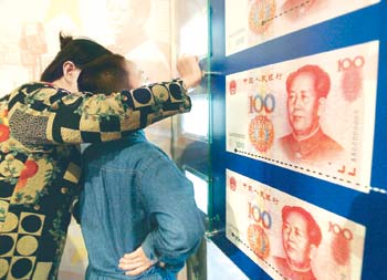 A woman and her son get a close-up view of a blown-up 100-yuan note at an exhibition in Beijing. With Washington threatening to adopt a tougher stance on China's currency and trade policies, Beijing has warned against the economic fallout of mounting international pressure for it to revalue the yuan. [China Daily HK Edition]