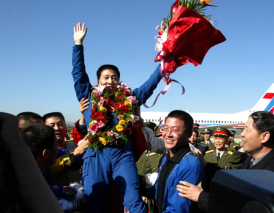After a physical exam on spot, Yang's condition was found as "good." He flew to Beijing less than two hours after landing as space fever spread and thousands gathered at Beijing's Millennium Monument for a celebration. Li Jinai, the commander of China's manned space program, called Yang a "space hero" and a "national hero". Following Yang's touchdown, China's premier Wen Jiabao immediately spoke to Yang from Beijing's command and control centre and offered his congratulations. "Great Leap Skyward," the country's national English newspaper China Daily enthused in its Thursday edition. The Chinese government quickly announced plans to eventually establish a permanent space station - and launch another Shenzhou spaceship within a year or two. This week's triumph, they said, is only the first step. Xie Mingbao, the director of China Manned Space Engineering Office, told a news conference that "Shenzhou 6" capsule would probably be launched "in one or two years' time." Though he didn't say so explicitly, such a launch would almost certainly be manned, and might home more than one astronaut. Yang's flight came four decades after the former Soviet Union and the United States pioneered manned spaceflight. Soviet cosmonaut Yuri Gagarin orbited the Earth in April 1961. One month later, the United States launched Alan B. Shepard Jr. The Beijing Aerospace Command and Control Center sent a message at about 5:35 a.m. Thursday to Shenzhou 5 instructing it to return as planned. Shown on a screen in the mission control center, the capsule made a gentle turnaround upon receiving the order.