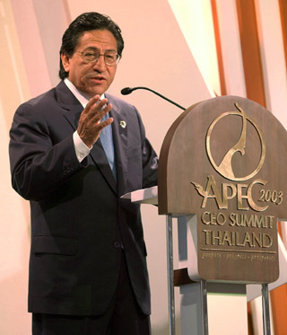 Peruvian President Alejandro Toledo delivers a speech during the CEO Summit of the Asia-Pacific Economic Cooperation (APEC) in Bangkok October 19, 2003. [Reuters]