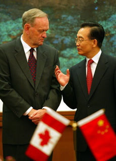 During the past 10 years, bilateral political ties have increased, Wen said. Over the same period, the volume of bilateral trade has tripled. "Practice has proven that Sino-Canadian relations can develop steadily as long as the two nations treat each other with mutual respect and equality, seeking common development while acknowledging differences,'' Wen said. Visiting Prime Minister Chretien said Canada is satisfied with the growing friendship between the two peoples and hopes bilateral trade will double by 2010. Statistics from the General Administration of Customs of China indicate that China's trade volume with Canada in the first eight months of 2003 was US$5.18 billion, up 6.7 per cent year-on-year. From January to August this year, China's exports to Canada totalled US$2.74 billion dollars, up 22.7 per cent, and its imports from Canada totalled US$2.44 billion, down 7.0 per cent, Xinhua reported. To build on existing links, Wen suggested the two nations continue high-level exchanges and strengthen current consultation and dialogue mechanisms in politics and economics. The two countries should also tap the potential of and seek more partnerships in energy, environmental protection, telecommunications, insurance and agriculture. And they should consult and co-ordinate more in international and regional organizations to maintain world peace and seek common development, Wen said. After their meeting, the two leaders attended the signing ceremony for a joint statement on strengthening dialogue and co-operation on climate change. A memorandum on a scholar exchange programme and a letter of intent on infant and women's health, legal co-operation and agricultural development were also signed. Chretien then met with Wu Bangguo, chairman of the Standing Committee of the National People's Congress (NPC). He said Canada would like to work with China on its staging of the 2008 Olympic Games in Beijing. The Canadian prime minister will also meet Jiang Zemin, chairman of the Central Military Commission, and members of the Canada-China Business Council during his four-day official visit, which ends tomorrow.