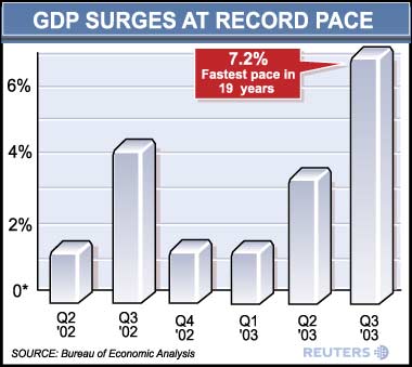 U.S. gross domestic product surged at an unexpectedly strong 7.2 percent annual rate in the July-September period, a Commerce Department report showed. The sizzling pace of growth -- reflecting not just a splurge by shoppers but a big step up in business spending -- was the briskest since the first quarter of 1984 and more than double the second quarter's 3.3 percent advance. "This is a great report for the economy," said Cary Leahey, senior U.S. economist at Deutsche Bank Securities. "Not only was the headline strong, but the mix was good and it implied a good fourth quarter." Three other reports on Thursday also suggested a firmer recovery was taking root -- new claims for jobless benefits and a help-wanted index suggested some stability in the labor market, while companies spent more on wages and benefits. The jump in GDP handily beat forecasts on Wall Street, where economists had looked for a gain closer to 6 percent. Stocks rallied briefly on the GDP data but closed little changed on the day. Bond prices fell as investors guessed the report brought nearer the day the Federal Reserve would raise interest rates from bargain-basement levels. SHOP 'TIL YOU DROP Consumer spending shot up at a rapid 6.6 percent pace as lower tax withholding on paychecks and child tax credit checks put more cash in shoppers' hands. It was the biggest gain since early 1988 and accounted for nearly two-thirds of GDP growth. Economists expect growth to moderate from its recent break-neck pace as the boost from tax cuts fade, although most expect it to settle near a still-solid 4 percent rate in the current quarter and hold around that rate next year. U.S. Congress passed a US$350 billion White House tax plan in the spring that lowered tax-withholding rates and pumped out about US$13.7 billion in child tax rebates in July and August.