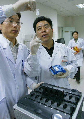 carries out an experiment with an assistant November 2, 2003. Cai's lab