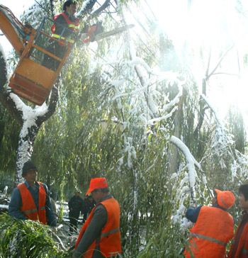 | | Street cleaners trim off broken willow branches in downtown Beijing yesterday after a night of heavy snow, the first major snowfall of the winter. The white stuff, though bringing delight to many, greatly affected drivers and pedestrians. [newsphoto.com.cn] |