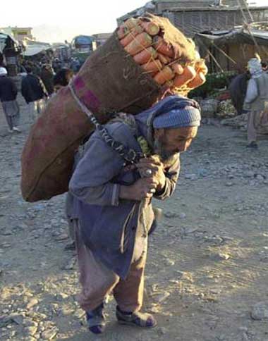 on his back from a vegetable market in Kabul Tuesday, Nov. 11, 2003.