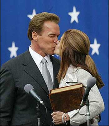 Arnold Schwarzenegger (L) kisses his wife