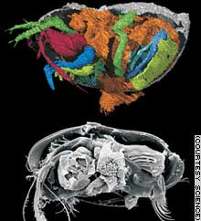 Details revealed include gills, eyes, limbs designed for swimming and the oldest know male organ in the fossil record. It was this last that led researchers to name the new species, Colymbosathon ecplecticos, which is Greek for "amazing swimmer with large [you know what]." "The whole animal is amazing," David Siveter, a researcher at the University of Leicester, said in a statement. He is first author of a study appearing this week in the journal Science. Thomas M. Cronin, a U.S. Geological Survey geologist, said in an interview that the discovery by Siveter and his team "is significant for a number of reasons." Cronin said the animal is the oldest male in the fossil record and the specimen contains images of soft parts that could only be guessed at by analyzing other 425-million-year old fossils. "Any fossil with soft parts from the Silurian [430 million to 400 million years ago] is unusual," he said. "They've been able to basically dissect and describe features we never see in fossils." Siveter and his team used a new technique that combined thin-film cutting and data storage in a computer. They removed the rock containing the fossil and then cut extremely thin shavings through the remains. Each shaving was then photographed and stored in a computer. Later, the researchers were able to electronically reassemble the slices and create a three-dimensional image of the animal, along with its soft parts. That, Cronin said, has never been done before for such an ancient animal. Modern relatives of C. ecplecticos are found in virtually every aquatic environment on Earth, from deep oceans to shallow streams. They are bivalves, but are more closely related to crabs and lobsters than to clams or oysters. Most animals in this group graze on dead organic matter. C. ecplecticos was about 0.20 inch at its widest dimension and its soft body parts closely resemble those of its modern relatives. Cronin said this close similarity shows that the ostracode group of animals has changed remarkably little over hundreds of millions of years, even though most other species underwent significant evolutionary redesign or disappeared altogether. "This specimen shows what nobody has been able to show before -- 425 million years of unbelievable stability in an organism," he said. "Most things that lived in the Silurian are long extinct and don't have many living relatives."
