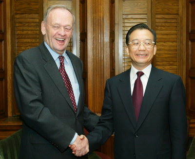 Deals for the sale of Canadian potash and Canadian wheat were also finalized at the ceremony. "We had a fruitful meeting during which we exchanged in-depth views and reached broad consensus on bilateral ties, regional and international issues of mutual interest,'' Wen said following the ceremony. "All this indicates that Sino-Canadian trade and economic co-operation are making solid headway,'' he said. Chretien echoed Wen. "Today's agreements will further enhance bilateral trade, international health and people-to-people ties and contribute to a better understanding of both countries judicial systems,'' he said. Analysts said the meeting served as a cornerstone for his Chrestien's 10-year prime ministerial career. "The stronger trade ties and economic partnership not only serve the fundamental interests of the two countries, but contribute to peace and development in the Asia-Pacific region and the world at large.'' Wen noted. During their talks, Wen said he made four suggestions, to which Chretien agreed. First, Wen said the countries should establish a research facility at the vice-ministerial level on Sino-Canadian relations and co-ordinate stance on major international issues.