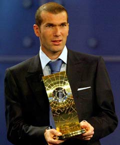"This is a prize that is very special and it feels better every time you win it," said Zidane. "I am very happy to have won it this time and especially to have beaten my friend Ronaldo - especially as he is much younger than me." Zidane is 31 and Ronaldo, who came third, only 27, while the man who finished as runner-up to 'Zizou' this year, Thierry Henry of France and Arsenal, is 26. "He is a fantastic player and he will do great things in future," said Zidane, of the highly-rated Henry. Ronaldo, who starred in Brazil's World Cup winning team last year and won the award for the third time when it was awarded to him in Madrid, said: "I am happy to be here - but third is not the same as first, is it? I would prefer to have won it, but I am happy for Zidane." Zidane has now won the FIFA World Player award three times in six years. He has lifted the prize in 1998, following France's World Cup triumph, in 2000, after they won the European Championship, and again in 2003. Ronaldo won the award in 1996, 1997 and 2002. Henry was widely favoured to win and become the first player from an English club to lift the award since it was inaugurated in 1991 when Germany's Lothar Matthaeus was the first winner. He picked up 186 points from the votes of the 142 national team coaches, 21 picking him in first place, and 22 in second, while Zidane had 35 coaches votes in first place and 27 in second. Ronaldo was given 26 first-place votes, but only 11 for second. The points system was five for first place, three for second and one for third and in the final totals Zidane had 264, Henry had 186 and Ronaldo 176. PROUD HENRY Asked if he felt disappointed, Henry said: "Yes and no - I am proud to be here and be with these great players and that is very good. Of course, I thought about winning, beforehand, but now I have decided this is just the beginning and I will be back." Henry, for whom Arsenal rejected a reported offer of 50 million pounds last week from Chelsea and in whom Real Madrid president Florentino Perez has expressed strong interest, said he was very happy to stay with Arsenal "for as long as they want me." In the voting details released by FIFA, it was revealed that Brazil coach Carlos Alberto Parreria voted for Van Nistelrooy, England's Sven-Goran Eriksson voted for Roberto Carlos, France's Jacques Santini voted for Paolo Maldini, Germany's Rudi Voeller voted for Pavel Nedved, Italy's Giovanni Trapattoni vogted for Roberto Carlos and Spain's Ignacio Saez Ruez voted for Zidane. Nedved of the Czech Republic and Juventus was fourth with 158 points and Roberto Carlos of Brazil and Real Madrid fifth with 105. Van Nistelrooy of Manchester United and the Netherlands was sixth and David Beckham of Real Madrid and England was seventh ahead of his club-mate Spaniard Raul and Italian Paolo Maldini who captained AC Milan to their European Cup triumph this year. The winner of the FIFA women's world player of the year was Birgit Prinz of Germany, top scorer for the World Cup winning German team ain the United States. In the remaining awards, Brazil won the FIFA/Coca Cola world ranking top team for 2003, Bahrain won world ranking best mover, Celtic's supporters won the FIFA Fair Play award for their exemplary behaviour at the UEFA Cup final in Sevilla and the Iraqi football community won the FIFA Presidential Award.
