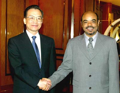 Premier Wen Jiabao meets with his Ethiopian counterpart Meles Zenawi December 15, 2003. Wen said that China is ready to work more closely with Ethiopia to further boost bilateral ties. The Chinese premier is on the last stop of a four-nation tour which has taken him to the United States, Canada and Mexico. [Xinhua]