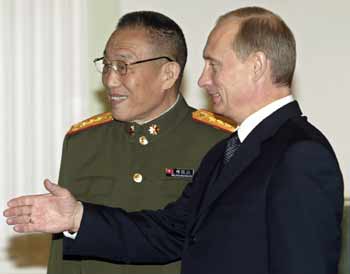 Russian President Vladimir Putin (R) gestures during his meeting with Chinese Defense Minister Cao Gangchuan in Moscow, December 18, 2003. [Reuters]