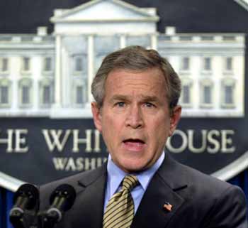 US President George W. Bush addresses the media at the White House in this image taken from video, December 19, 2003. Bush on Friday announced that Libya has disclosed nuclear and chemical weapons programs and has agreed to eliminate them. [Reuters]