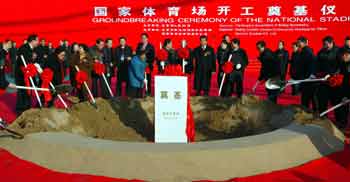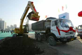 Municipal Committee (R) and acting Beijing Mayor Wang Qishan break the