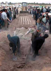 Distraught relatives wept next to corpses shrouded in blankets. Hundreds of bodies were bundled into trucks. Mechanized diggers hollowed out trenches where the dead were buried quickly without rites.