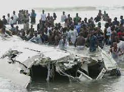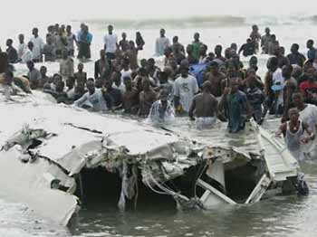Rescue workers battled high waves to free bodies from the wreckage of an airliner which crashed into the sea off the West African state of Benin, killing at least 111 people on December 26, 2003. [Reuters]