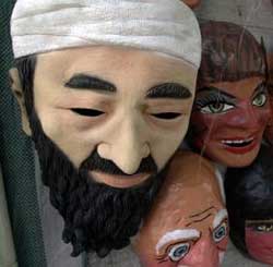 A mask of Osama Bin Laden hangs with other of Ecuadoreans in a shop in Quito, Ecuador Tuesday, Dec 30, 2003. On New Year's eve Ecuadoreans traditionally burn effigies on New Year's Eve to kill off bad luck from the outgoing year.  [AP]
