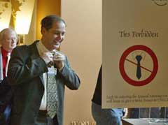 For those who missed the announcement in documents sent ahead of time, a large poster at the entrance to the Congress Center on Wednesday's opening day showed a necktie surrounded by a circle with a slash through it.