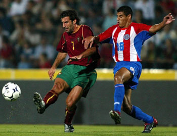 Portuguese soccer player Luis Figo (L) kicks the ball as he is challenged by Paraguain Carlos Bonet (R) during a friendly match at May One stadium in the Portuguese Northern city of Braga June 6, 2003. [Reuters]