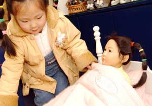 her 'twin doll,' Feb. 9, 2004. The shop makes twin dolls to orders from