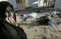 An Iraqi woman stands next to the bodies in front of the city morgue, following a suicide bomb attack in the town of Iskandariya, Iraq February 10, 2004.[Reuters]