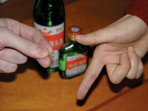 Here's what's going on: Players use their fingers to express a number between one and eight, while yelling a phrase that represents a number in the same range. If you yell the number that the other guy shows with his fingers, you drink. If he yells your number, he drinks. It's simple, but it's all about speed - you should be yelling at a rapid pace (note that if you yell your own number you drink, and look stupid to boot).