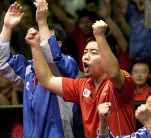 It is the 14th team title collected by the all-conquering team whose winning tradition dates back to the Beijing World Championships in 1961. Sunday's victory just completed China's success in the Doha tournament. The women defeated Hong Kong to take their sixth straight and 15th overall team title on Saturday. Wang Hao squared up against Timo Boll in the opening rubber at the Qatar International Exhibition Center. Perhaps feeling the effects of heroic play that carried his team to the finals, the German capitulated tamely in straight sets. Then, it was the turn of world No 1 Ma Lin, with Christian Suss at the other end of the table. Suss, who bears more than a passing resemblance to Boris Becker, put up stoic resistance against the world's top player. After losing the first set he raced to a 5-0 lead in the second, winning 11-8. Ma then took control and, despite not playing his very best, his attacking right hand top spin had Suss on the defensive. During one rally the German was pushed so far away from the table that he was in danger of feeling the waters of the Gulf lapping about his feet. World champion Wang Liqin then secured China's victory with a 3-1 verdict over Zoltan Fejer-Konnerth, who is some 68 rungs below Wang in the rankings. ***Supremacy Challenged China's supremacy at table tennis appears as secure as Fort Knox, but national women's team coach Lu Yuansheng believes action is needed to keep his players one step ahead of the game. "The gap between the strong and the weak is closing. When we go home we have to find new ideas - otherwise we could be in danger," Lu warned after watching his team beat Hong Kong 3-0 to collect their sixth straight gold at the world table tennis championships here on Saturday. Yesterday, China's men's team also won the gold after defeating Germany 3-0 in the final. Lu's prophecy may well be received with a certain degree of wry amusement by teams like Hong Kong, South Korea and Chinese Taipei, not to mention Germany and Russia, who have all come off second best to the champions in Qatar this week. China holds the sport in the palm of its hands - only a united team from Korea in 1991 has managed to muscle in on the Chinese women's domination of the team championships in a remarkable winning run stretching back to Ljubljana in 1965. Lu said his number one aim now is to prepare his squad for the Athens Olympics. "The Olympics are the top priority. When we return we'll find out what we've learned here to prepare for the Games." His remarks followed China's largely one-sided final against Hong Kong, with the reigning champions' top player Zhang Yining setting China on its way, dropping just one set against Tie Yana. Tie defeated Zhang in the semi-finals at the 2001 Universiade in Beijing en route to the title. Wang Nan than came off best in a five setter against Lau Sui Fei before 16-year-old Guo Yue came from a set down to defeat Zhang Rui 3-1. The top seeds have looked a class above their rivals, and hard though Hong Kong tried they could not come up with a way of breaking through the impregnable Chinese wall. Lu has mixed and matched his squad in Qatar and he caused a minor surprise picking team-championship debutant Guo over a more seasoned competitor like Li Ju or Niu Jianfeng. He explained: "I picked Guo because although she's only played once before the final I thought her technical ability would help us and give her good experience. She coped with the pressure well." And although Zhang is No 1 in the world, it is her close friend Wang who is the team's anchor.