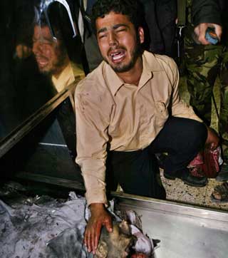 A Hamas supporter cries next to the remains of Hamas leader Sheikh Ahmed Yassin in Shifa hospital in Gaza City March 22,2004. [Reuters]