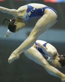 Australian duo Chantelle Michell and Loudy Tourky fought their way to the runner-up place on 271.31 after overtaking Britain's Tandi Gerrard and Jane Smith in the last dive. The British divers had to settle for the bronze by a tiny margin of 0.09 point. Carrying on China's gold sweep in the tournament serving as one of the national Olympic trials, Guo and Wu took it for granted for their victory. "We did not pay much attention to other divers during the competition. We just mind our own business,"said Guo, who clinched both titles in the 3m springboard and the synchronized event at the Barcelona World Championships last July. Lao Lishi and Li Ting also met little challenge in their run for the women's platform synchronized title when the platform synchronized world champions eased to the first place on 347.82. Loudy Tourky took her second silver here after She partnered Lynda Dackiw to collect 297.99 points while Russian pair Natalia Goncharova and Yulia Koltunova were ranked third among the four pairs of competitors in the final. Lao talked in a relieved manner about the victory after she surrendered the platform gold to her national teammate Li Na on Friday. "We had great team work during the match, which brought us the victory,"she said. "But we have to improve on some details of our moves, I mean, every single move." |