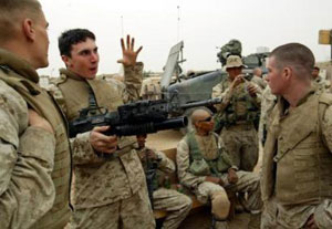 Lying on his stomach on a rooftop and wearing goggles and earplugs, a Marine sniper keeps an eye to his rifle sight. His main task in recent days has been trying to hit the black-garbed gunmen who occasionally dash across the long street in front of him. To dodge his shots, one of the gunmen recently launched into a rolling dive across the street, a move that had the sniper and his buddies laughing. "I think I got him later. The same guy came back and tried to do a low crawl," said Lance Cpl. Khristopher Williams, 20, from Fort Myers, Fla. Others have run across the street, hiding behind children on bicycles, said the sniper. In his position — reachable only by scaling the outside ledge of a building — he sits for hours with his finger poised on the trigger of a rifle that fires 50-caliber armor-piercing bullets with such force that the muzzle flash and exiting gasses from the weapon have blackened the bricks around the gun. On the street in front of his position sits a car riddled with bullets, where the bloated, fly-infested bodies of three armed men have been left. The vehicle was shot up by Marine gunmen before the sniper set up his position. Along the front line, Marines have been firing warning shots to scare away dogs chewing on corpses. In some cases, the troops have wrapped bodies in blankets and buried them in shallow graves. At night, the psychological operations unit attached to the Marine battalion here sends out messages from a loudspeaker mounted on an armored Humvee. On Thursday night, the crew and its Arabic-language interpreter taunted fighters, saying, "May all the ambulances in Fallujah have enough fuel to pick up the bodies of the mujahadeen." The message was specially timed for an attack moments later by an AC-130 gunship that pounded targets in the city. Later, the team blasted Jimi Hendrix and other rock music, and afterward some sound effects like babies crying, men screaming, a symphony of cats and barking dogs and piercing screeches. They were unable to draw any gunmen to fight, and seemed disappointed. |