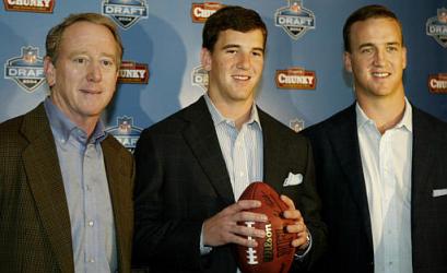 Archie Manning, left, former New Orleans Saints quarterback, is shown with his sons Eli, center, former Mississippi quarterback, Peyton, right, Indianapolis Colts quarterback, during a news conference in New York, Thursday, April 22, 2004. Eli is a top prospect in this weekend's NFL Draft. [Reuters]