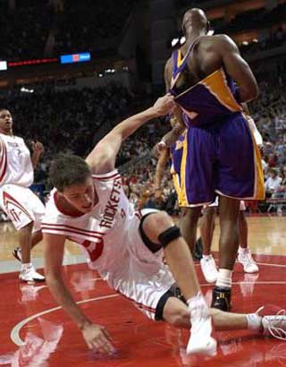 The last of Malone's three steals, along with his second offensive rebound, put the finishing touches on the Lakers' 92-88 overtime victory Sunday for a 3-1 lead in the best-of-seven series. Game 5 will be Wednesday night, with the Rockets trying to stay alive after coming so close -- just as they did in Game 1 -- yet failing to win. Houston held Los Angeles scoreless over the final 4 1/2 minutes of regulation and led by as many as four in overtime before Los Angeles closed the game with an 8-1 run. Malone surpassed his regular-season scoring high by 10 points, playing most of the game with a ripped jersey after he was in the middle of a first-half altercation. Kobe Bryant scored six of his 18 points in overtime, including a three-point play that put the Lakers ahead with 40 seconds left. Malone then stole the ball from Steve Francis, and the Lakers let the clock run down before Derek Fisher missed a jumper. Malone grabbed the rebound and was fouled, clinching the victory by making a free throw with a satisfied grin on his face. Whatever it was that motivated Malone, it worked. He had been criticized a day earlier by Rockets owner Leslie Alexander, who said he should be suspended for being a dirty player, and he got into an early face-to-face shouting match with Francis after Malone undercut Rockets forward Bostjan Nachbar. The tension also extended to Houston coach Jeff Van Gundy, who cursed loudly and directly at longtime nemesis Phil Jackson of the Lakers late in the first quarter, then sprinted onto the court during an altercation moments later. The game also featured Bryant getting poked in the eye, Yao Ming fouling out and Gary Payton getting some playing time down the stretch after sitting out the fourth quarter of Games 2 and 3. Shaquille O'Neal was not a big part of the offense for the Lakers, scoring 17 points with 12 rebounds. Malone helped make up for O'Neal's lack of production and joined Kareem Abdul-Jabbar as the only 40-year olds to score 20 or more points in a postseason game. Malone had 20 points, eight rebounds and one technical foul by halftime, getting the tech for storming after Nachbar after the Slovenian forward fouled him on a breakaway layup. On the previous possession, Malone stuck his hip out as Nachbar went in for a dunk and knocked Nachbar off-balance. Nachbar reached back while still in the air and grabbed the back of Malone's jersey, ripping it. Francis immediately confronted Malone, and Van Gundy sprinted onto the court -- similar to what he did during a 1998 Heat-Knicks playoff series when he grabbed onto Alonzo Mourning's leg during a more heated confrontation. Van Gundy already showed how fired up he was moments earlier, cursing twice at Jackson after the Lakers coach apparently said something to him as Van Gundy drifted toward center court to vehemently argue a non-call. Yao took over the defensive assignment on Malone for the first seven minutes of the third quarter, and his fifth foul came on a dunk by O'Neal with 10:37 left in the fourth quarter. He didn't return until 2:38 remained, but the Rockets were able to close the gap while he sat, using a 6-0 run -- during which Bryant was poked in the left eye by Francis while going for a loose ball -- to pull to 77-75. Francis nailed a 21-footer to tie it at 81-81 with 39 seconds left. Bryant missed on a drive with 28 seconds left, and Francis shot an airball against Fisher's defense. That led to a 24-second violation and gave the Lakers 3.1 seconds for a final shot, but Bryant shot an airball. Malone drew Yao's sixth foul with 1:27 remaining and converted a three-point play to cut the Lakers' deficit to 87-86, and Bryant scored off a steal -- ending his string of seven consecutive missed shots -- to put Los Angeles ahead with 1:12 left. Francis tied it by making one of two before Bryant, forced left by Cuttino Mobley, drove around him, made a layup and was fouled. The three-point play put Los Angeles ahead to stay. Francis led Houston with 17 points. |