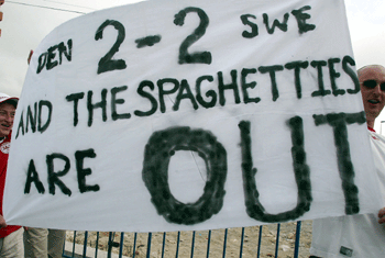 Sweden, Denmark and Italy all finished on five points in Group C, with the Swedes top on goals scored. Sweden play the Group D runners-up, Germany, the Netherlands or Latvia, in the last eight, while the Danes face the Czech Republic. "Fantastic, fantastic, it's a feeling of joy that you just can't describe," said Sweden striker Henrik Larsson. Sweden looked to be heading out of the tournament as Denmark led 2-1 thanks to two goals from striker Jon Dahl Tomasson. The Swedes had already recovered once with a Larsson penalty, though, and were rewarded for their resilience when Jonson pounced on a loose ball to beat Thomas Sorensen from eight metres. Both sets of fans cheered and danced as Sweden played keep-ball to close out the game and the two teams threw themselves skidding across the pitch to celebrate. There was no hint of a friendly fix at the start of the game, as the tackles came flying in from both sides. Fizzing runs With the ball skidding around on a pitch that had already been watered before kickoff, Denmark worried their opponents continually with sharp balls through the middle and the fizzing runs of wingers Jesper Gronkjaer and Martin Joergensen. Gronkjaer popped up to take Tomasson's pass on 14 minutes and fire a shot into the side netting. With Sweden sitting deep, Denmark continued to attack and Tomasson claimed the opener just before the half-hour mark with a spectacular dipping shot from 20 metres. Sweden nearly equalised twice at the end of the first half, with defender Olof Mellberg and midfielder Jonson both sending in dangerous headers from corners, and they were level within two minutes of the re-start through Larsson. The recently returned striker raced on to a ball in the penalty area and was brought down by Sorensen. Larsson then stepped up to score his third goal of the tournament. Sweden enjoyed a period of dominance but outstanding goalkeeping by Sorensen kept Denmark in the game, and Tomasson's sharpness brought further reward after 66 minutes. Substitute Kasper Bogelund had an effort half blocked by the defence and the ball fell straight to Tomasson who slipped a low shot past Isaksson from eight metres for his third goal at Euro 2004. Denmark looked to be heading for the quarter-finals as group winners, holding on relatively comfortably before Jonson's late intervention. |