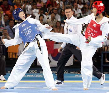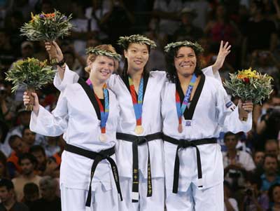 Earlier the day, Chen kept her winning run by defeating Silva of Brazil 8-5 in semifinal and Adriana Carmona of Venezuela 7-5 in quarterfinal. During the semifinal, Chen, who earned her Olympic gold in the same category in Sydney, fought a close round one but prevailed in round two and three, scoring one points, four points and three points, respectively. At one point in round three, the 30-year-old Silva struck Chen' s head and earned a much coveted two points. But Chen's later strong showing proved that was only a temporary surprise. In another semifinal, Baverel scored five points in three rounds but had two points deducted after receiving four kyong-gos (warning penalties) in beating Nadin Dawani of Jordan 3-3 in another semifinal. Chen cruised into the match after beating Adriana Carmona of Venezuela 7-5 in the quarterfinals earlier the day. In the quarterfinal, Chen kept a steady pace throughout the three rounds and prevailed, scoring two points in round one, two points in round two and four in three. But she had one point deducted after receiving two kyong-gos ( warning penalties). Chen defeated Yoriko Okamoto of Japan 7-5 to progress into the quarterfinal earlier Sunday. The 31-year-old Carmona, who had finished fifth in the heavyweight over 70kg at the World Championships in 2003, won by superiority 8-8 over Sarah Stevenson of Britain. The program of the final day of Olympic taekwondo competitions featured the women's over 67kg division and men's over 80kg, with top athletes from all over the world providing a spectacular finale. As a martial art sport, taekwondo became an official sport at the Sydney Olympics after participation in the 1988 and 1992 Games as a demonstration sport. In recent years, taekwondo has become a modern amateur sport and has maintained the tradition and spirit of martial science. Today, taekwondo is one of the most popular international sports, being practised in 157 countries and regions with more than 50 million participants throughout the world. |