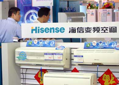Hisense air-conditioners compete with other brands of household electrical appliance in a shopping market in Beijing. Zhu Shuqin, Hisense's spokeswoman, said the fact Bosch-Siemens Household Co Ltd has registered her company's trademark in the European Union market so far has not affected its business in Europe, due mainly to the complete sales network it has established in the region. [photocome]