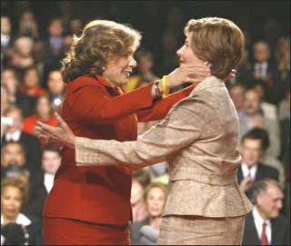 The president said Kerry's proposal would cost the government $7,700 per family. "If every family in America signed up, it would cost the federal government $5 trillion over 10 years," he said. "It's an empty promise. It's called bait-and-switch." The two men disagreed over abortion, Kerry saying the choice should be "between a woman, God and her doctor." The president said he wants to promote a "culture of life, and said Kerry voted "out of the mainstream" when he opposed legislation to ban so-called partial birth abortions. Asked directly whether he supports overturning the 1973 Supreme Court ruling that gave women the right to abortion, Bush sidestepped. "What you're asking me is will I have a litmus test for my judges, and the answer is no," the president said. The president dodged a bit, too, when the issue of a minimum wage increase came up. Kerry said emphatically he favors one, and said that Republicans in control of Congress had repeatedly blocked Democratic attempts to pass legislation. Bush said he supported "Mitch McConnell's" bill to raise the minimum wage, without explanation. McConnell is a Republican senator from Kentucky. As a candidate four years ago, Bush said he favored raising a minimum wage so long as individual states were permitted to exclude workers within their borders. Bush and Kerry agreed on one point, stating that marriage should be preserved for heterosexual couples. But they gave different answers when asked about whether homosexuality was a choice. "I don't know," said the president. Kerry referred to Vice President Dick Cheney's gay daughter, and said it was not a choice. "We're all God's children," he said. Kerry said that the recent expiration of a ban on certain semiautomatic weapons was a "failure of presidential leadership" and that because of it, terrorists can purchase weapons at gun shows in the United States. Bush said there weren't enough votes in Congress to extend the ban. But Kerry said if he were told by Tom DeLay he'd insist on a fight to win the necessary support. DeLay, R-Texas, is the House majority leader and an opponent of gun control. Asked about the Catholic bishops who have advised parishioners it would be a sin to vote for a candidate who supports abortion rights, Kerry evoked the name of John F. Kennedy, another Massachusetts senator and the first Catholic elected president. He quoted Kennedy's famous 1960 campaign statement in which he said he wasn't running to become a Catholic president, but the first president who happens to be a Catholic.