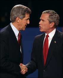 "There's a mainstream in American politics and you sit right on the far left bank," Bush said in the final debate of a close and contentious campaign for the White House. "Your record is such that Ted Kennedy, your colleague, is the conservative senator from Massachusetts." Undeterred, the Democratic challenger said many of the nation's ills can be laid at Bush's feet. He "regrettably rushed us into war" in Iraq, Kerry said, and the country is less safe as a result. He said 11 consecutive presidents, Republicans and Democrats alike, have been hit with recession and war, yet "none of them lost jobs the way this president has." As for health care, the Democratic senator said, 5 million Americans have lost coverage under Bush's watch. "The president has turned his back on the wellness of America, and there is no system and it's starting to fall apart," Kerry said. Kerry and the president also debated abortion, gay rights, immigration and more in a 90-minute debate that underscored deep differences only 19 campaign days before Election Day. This debate was similar in format to the first — the two rivals standing behind identical lecterns set precisely 10 feet apart. Bush was on better behavior, though, and there was no grimacing and scowling this time when it was Kerry's turn to speak. Two instant polls made the Massachusetts senator out to be the winner of the debate and a third said it was a tie, but that said nothing about the encounter's impact on the race for the presidency. A wealth of surveys said that was close — and getting closer, with Bush and Kerry concentrating their time and money on a dozen or so battleground states. The encounter was also a policy wonk's dream — a blizzard of facts and figures, references to "budget caps" and other terms meaningful only to Washington insiders.