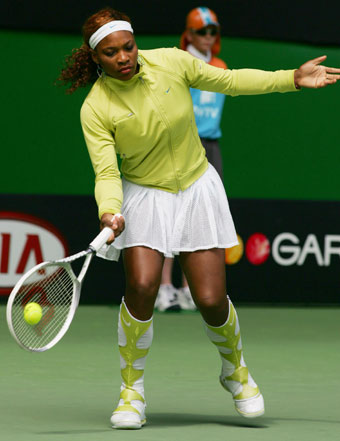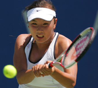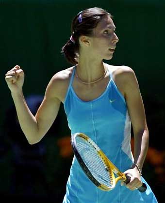 Anastasia Myskina of Russia celebrates her win after her first round match against Kveta Peschke of the Czech Republic at the Australian Open Tennis Championships in Melbourne Tuesday, Jan. 18. 2005. Myskina won the match 6-1, 6-4. [AP]
