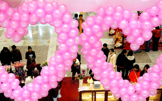 ![]() Heart-shaped pink balloons are hung up high to decorate a department store in Zhengzhou, Central China's Henan Province, February 13, 2005, as Valentine's Day falls today. The imported lovers' celebration fails to pull the nation's heart strings this year while people are still busy with the Spring Festival, the most important festival in the Chinese calender. [newsphoto] |