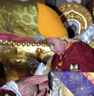 Today the Panchen's parents have joined him, sitting next to their son to eat. Before starting to eat, the young master and others recite Queba, a prayer which is indispensable for Tibetans before eating. It means "presenting this delicious food to the deities." The young Panchen invites his sutra teacher Jamyang Gyatso to begin the meal and the teacher asks the attendant waiters to fill his bowl with tea and helps himself to zamba. It crosses my mind that this may be the first time the young student has eaten in front of strangers, and he appears somewhat uneasy. Very quickly, however, he adjusts to the unfamiliar intrusion and begins to tuck into his breakfast as he would on any other day. According to one attendant, the young master loves zamba and buttered tea. "He has maintained the habit for years," he said. "Lunch is relatively rich, comprising Tibetan dumplings, beef dumplings and some dishes unique to the Tashilhungpo Monastery such as dough stuffed with minced meat, steamed bread, and noodles. He does not like fizzy drinks." Busy studies By modern standards the courtyard of the new residence of the 11th Panchen is small, but it is comparatively well removed from the bustling street outside. After breakfast, the 11th Panchen, his sutra teacher and parents take a walk in the courtyard. Even during this apparent leisure time, the young master does not lose a chance to learn something from his sutra teacher. "The master is given a heavy study task," a monk waiter tells us. "But taking a walk after meals is indispensable for him." Classes begin at 9:30. The classroom is a rectangular room with one wall adorned with tangka paintings. A Tibetan cabinet nearby the door is piled with sutra texts. Across the room is a large window which despite its size fails to let in much light. Fortunately the sutra books contain large words. When sutra teacher Jamyang Gyatso sits in his teaching position, the 11th Panchen kowtows to him three times before taking his place in front of the sutra teacher. Eight monks assigned to study together with him also kowtow to the sutra teacher and sit on the floor by the young master. Each of them produces their "textbooks" and together recite sutra lines and listen to the sutra teacher's interpretation of the texts. Today, the sutra teacher lectures on one of the five-volume Buddhist scripture "Tripitaka." The young master listens attentively. The young master is also obliged to study Chinese and English. His Chinese level is that of a primary school graduate. English class begins at 10:30, with a teacher surnamed Xu. When the class begins, teacher and student exchange greetings in English and review the previous class. After this, the teacher reads a text, explaining the meaning of individual words and the overall passage. Then it is the turn of the 11th Panchen to read and answer questions in English. "I teach him half a day twice a week," the teacher said. "The master is clever and has a good memory. In addition, he studies diligently. He can chat with me in simple English. His pronunciation is good. "The textbook we use is the second volume used in middle schools." When English class is over, it is time for lunch, followed at 2 pm by free-time. According to attendants around the young master, he spends the time reviewing lessons, using his computer, and reading science fiction books and newspapers. Computer and hobbies The young master bought a laptop in 2002 which he uses for his Chinese and English homework. Later on, when a Tibetan programme is opened up, he studies the software attentively. "The master loves what you call high technology," said an attendant. "He is good with computers, photography and video recorders. Given his heavy study load, however, he does not have enough time using them." Afternoon class begins again at 3:30 pm, this time in the Sunlight Hall of the Tashilhungpo Monastery. The topic of study is debating the doctrines of Buddhist scriptures. The hall, huge in size, is old Tibetan style. Participants include eminent monks from various Zhacang schools of the monastery and monks, plus audiences. The young master is the first to raise questions. Garqen Lobsang Namgyi with the open school claps his hands in answer to the questions. The young master asks one question after another, doing his best to raise difficult questions his linguistic adversary cannot answer. After some time, they change positions and it is the young master's turn to face questioning. In the face of a monk 10 years his senior, the young master answered questions carefully. Debating doctrines of Buddhist scripture is one of the ways to test the fruits of study. It is considered a kind of exam, if either student cannot answer a question during debate, he will try to find the answer afterwards by consulting the sutras. "What he learns are basic courses," said the sutra teacher of the young master. "Now I ask him to study, recite and understand what he learns. If he can lay a good foundation, it will be easier for him to learn more difficult sutras in the future. "He has received more than 700 empowerment and is studying Buddhist logic and epistemology. He is diligent and clever." When we leave the Sunlight Hall for the residence palace of the young master, it is about dinner time. The evening meal is composed of mutton stewed with carrots, meat with mushrooms, vegetables and some pickles and is followed by another postprandial stroll around the courtyard during which the young master discusses the progress of this afternoon's debate. After 7:30 pm, when the young master has watched TV news, he does Tibetan, Chinese and English and calligraphy homework in preparation for the next day. According to one teacher charged with the young master's Tibetan study, he is clever and has even begun studying Sanskrit. "He has a good command of Tibetan grammar," the teacher says. At 9:15 pm, the young master and others once again recite sutras together. At