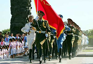 TheShenzhen Xinhe Handicraft Company is being sued by the PLA for nearly 2.5 million yuan (US$299,500) after using photos of three officers from the Guard of Honour and the regiment's name to advertise a toy saber and rifle. The montages were burnt onto CDs and albums and distributed to retailers around the country. The PLA's legal experts say the unauthorized use of the photos infringes personal rights and damages the regiment's reputation. They say they have resorted to court action after calls for the company to stop using the photos and its name fell on deaf ears for four years. The Beijing Haidian District People's Court yesterday accepted the case and will set a date for a later court hearing. "The name, Guard of Honour of the three armed services, has been frequently used by the defendant in advertising albums and CDs. Our exclusive right to the name has been violated," the PLA's document said. "Consumers misunderstood that the Guard of Honour made the advertisement. Our reputation has been violated," the complaint said. The document urges the court to order the company to stop using its name and pictures immediately and to issue a public apology. However, a spokesperson for Xinhe Handicrafts denied the accusation, adding that they had not been informed of the case.