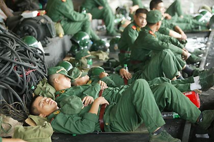 Armed police officers take a nap after a rescue mission in a mine at Huanghuai town in south China's Guangdong province, August 8, 2005. [newsphoto]