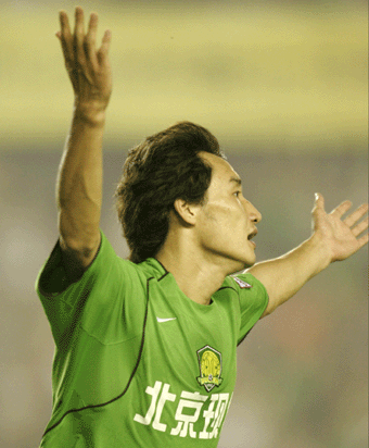 first round soccer match in Beijing, August 10, 2005. Gao scored twice to
